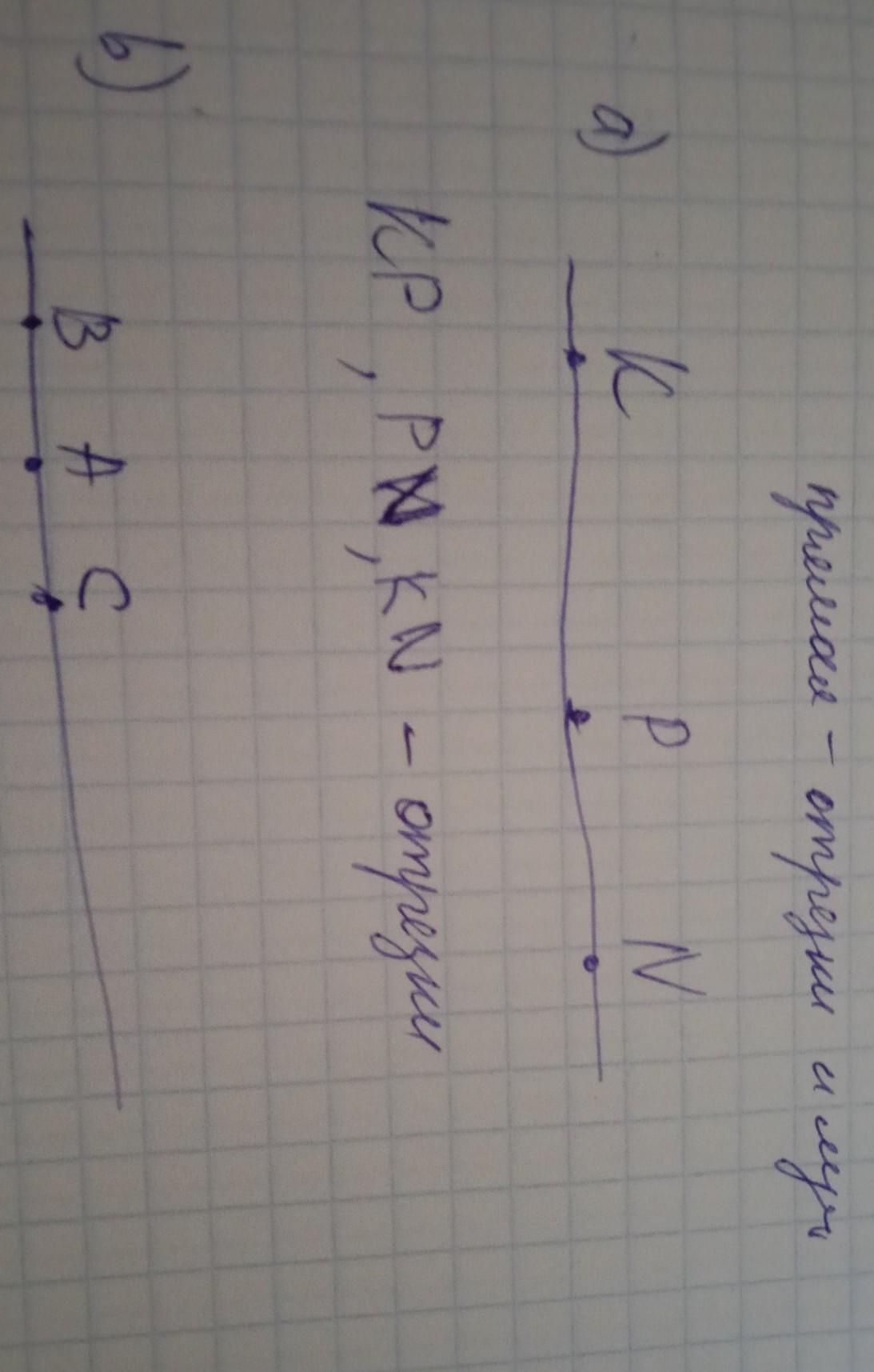 a) Отметьте точки К, Р и N так, чтобы через них можно было провести прямую. Как можно назвать эту прямую? Запишите все возможные случаи. b) Отметьте на прямой точки А, В, С так, чтобы А и В лежали по одну сторону от С, а точки А и С — по одну сторону от В.
