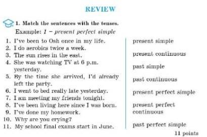 Present simple, present simple,past cont, past perfect, past simple, present cont, present perfect cont, present perfect, present cont, present simple