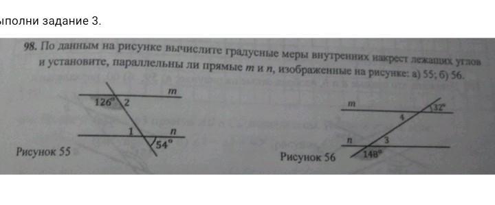 по данным на рисунке Вычислите градусную меру внутренних накрест лежащих углов и установите,паралельны ли прямые m и n изображенные на рисунке а) 55 б)56