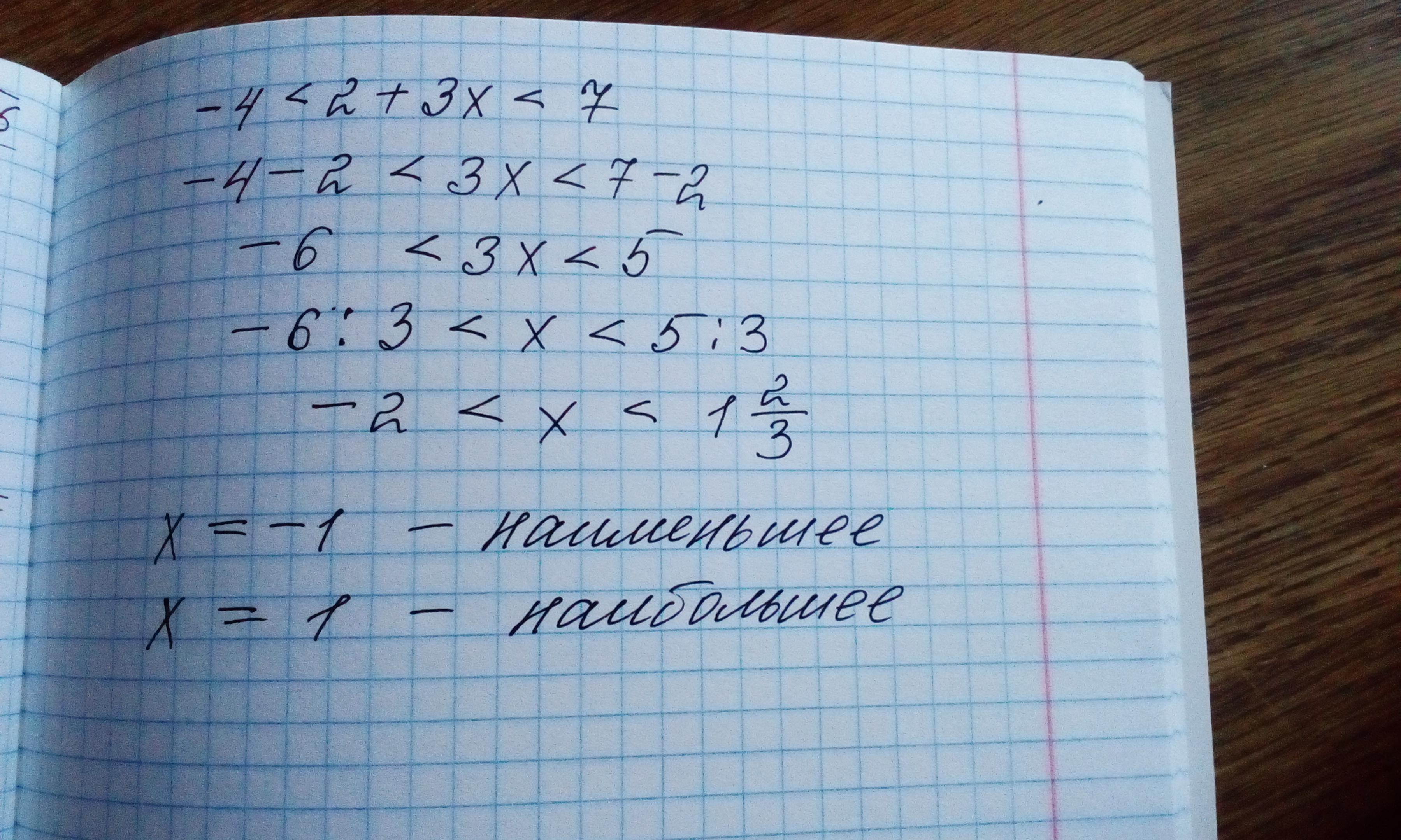 Решите двойное неравенство - 4<2+3x<7 и укажите наибольшее и наименьшее целое число, которое является его решением