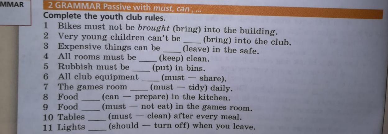 Ответ:brought, left,kept,put, must be shared, must be tidied, can be prepared, must not be eaten, must be cleaned, should be turned off
