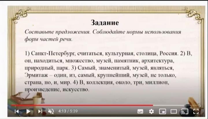Санкт Петербург считается культурной столицей России. В нем находится множество музеев, памятников архитектуры,природных парков.Самым знаменитым музеем является Эрмитаж-один из самых крупнейших музеев не только страны но и мира. в коллекции около трёх миллионов произведений искусства.