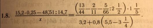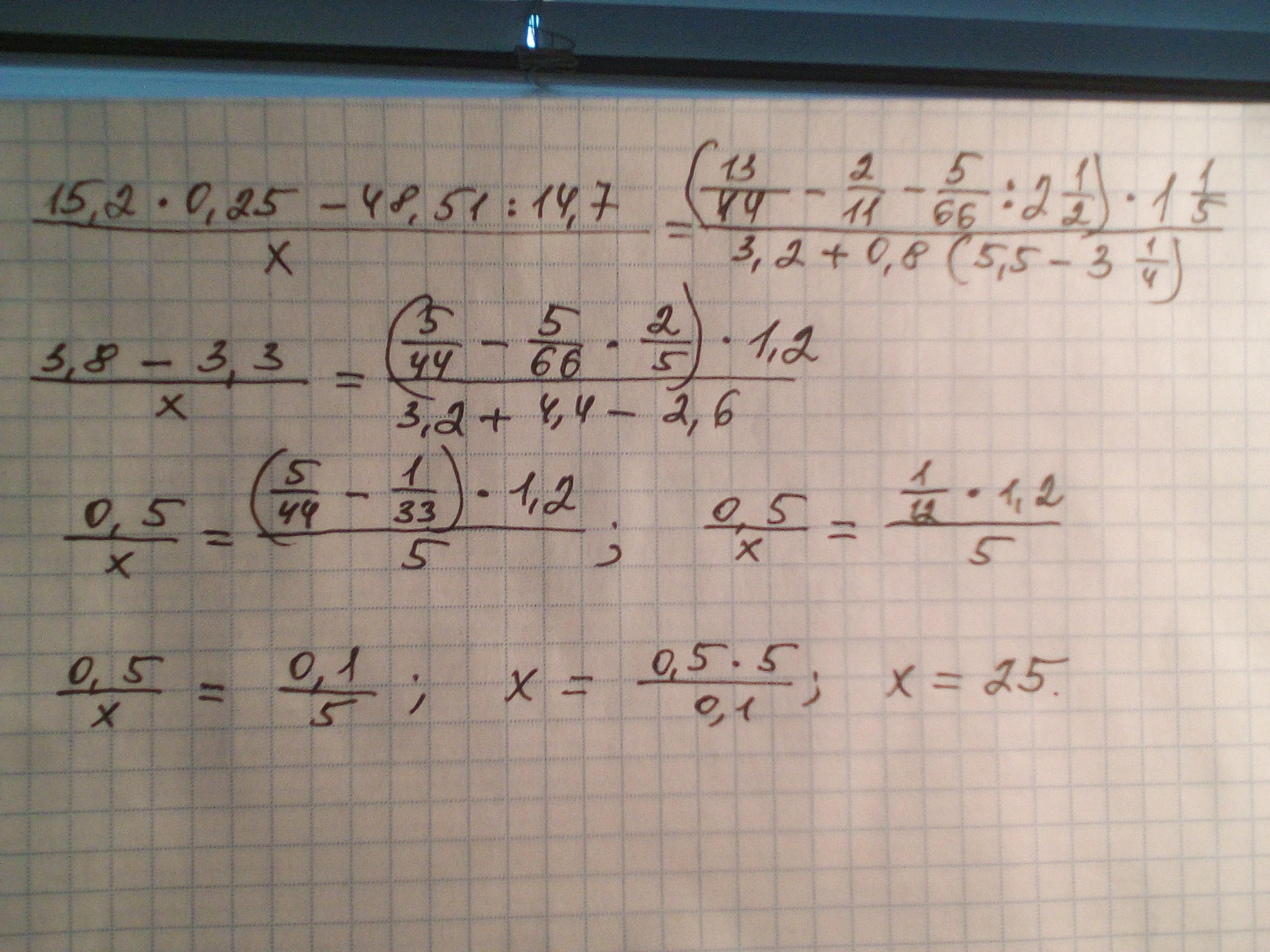 Числитель левой части 15,2*0,25-48,51 :14,7=3,8-485:147=3,8-3,3=0,5.