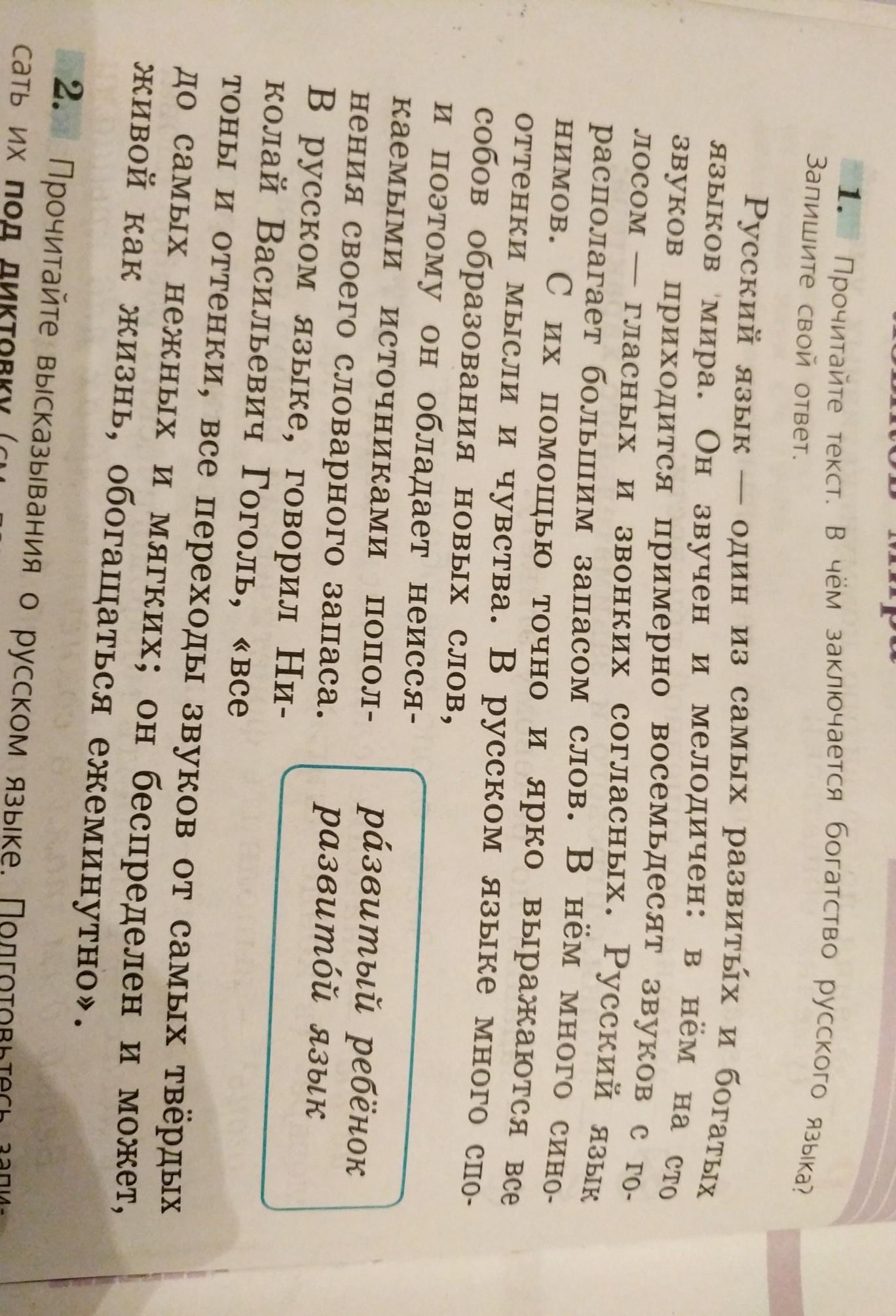 Русский язык — один из самых развиты́х и богатых языков мира. Он звучен и мелодичен: в нём на сто звуков приходится примерно восемьдесят звуков с голосом — гласных и звонких согласных. Русский язык располагает большим запасом слов.