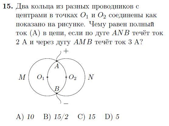 А дальше физика. Так как длина меньшей дуги ровно в два раза меньше длины большей, то и ее сопротивление в два раза меньше сопротивления большей дуги. При подключении к источнику напряжения через дуги меньших длин потекут в два раза большие токи, отсюда легко найти общий ток: