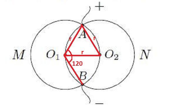 Задача по большей части геометрическая. Определим, во сколько раз дуга АМВ больше дуги АО₂В, для этого построим хорды и радиусы как показано на рисунке, очевидно, что треугольник О₁О₂А равносторонний со стороной, равной радиусу окружности. Дуга АО₂В опирается на центральный угол величиной в 120°, ее длина: