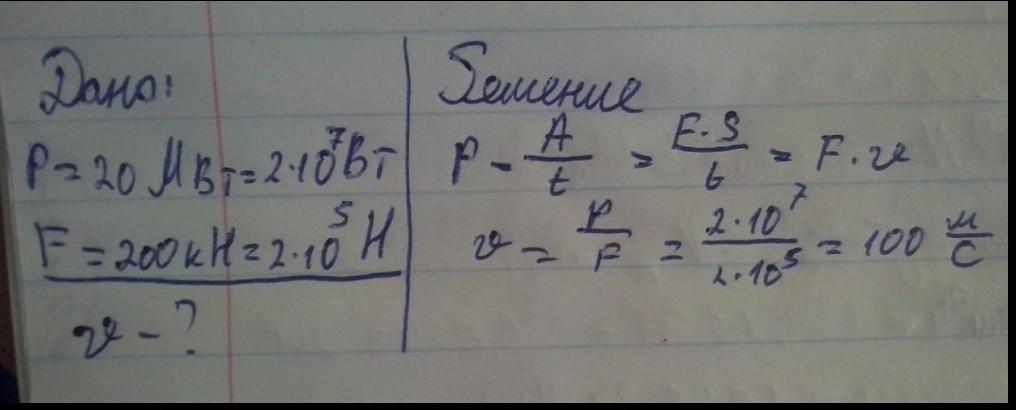 Двигатели корабля развивают мощность 2 МВт. Определите скорость движения корабля, если сила сопротивления воды равна 200кН