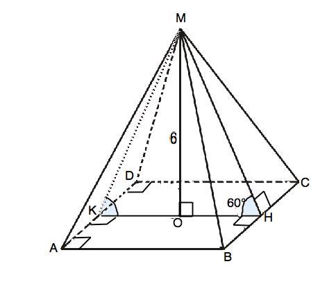 В правильной четырехугольной пирамиде апофема образует с плоскостью основания угол 60 градусов.Высота пирамиды равна 6 см.Найдите площадь поверхности пирамиды.