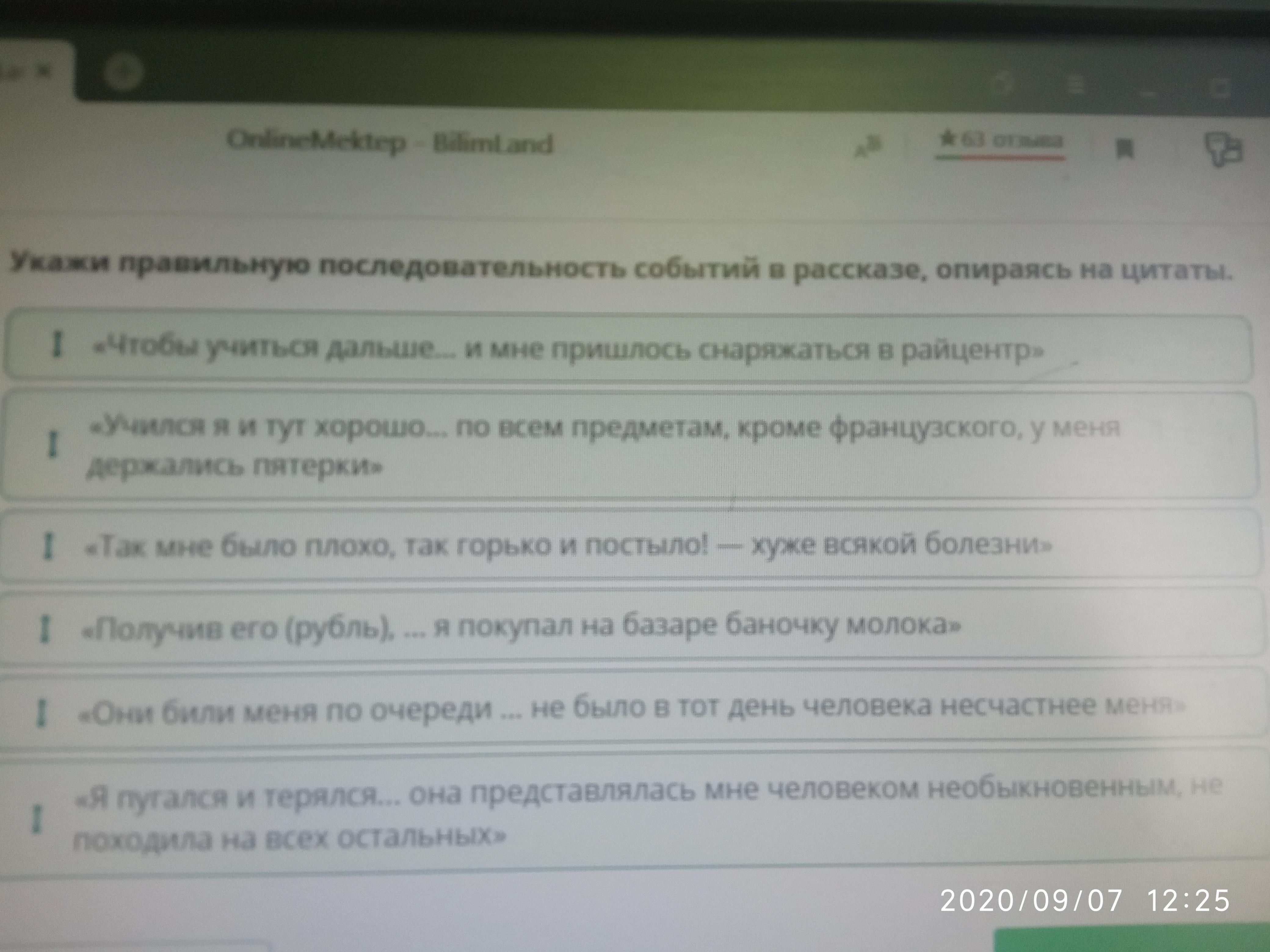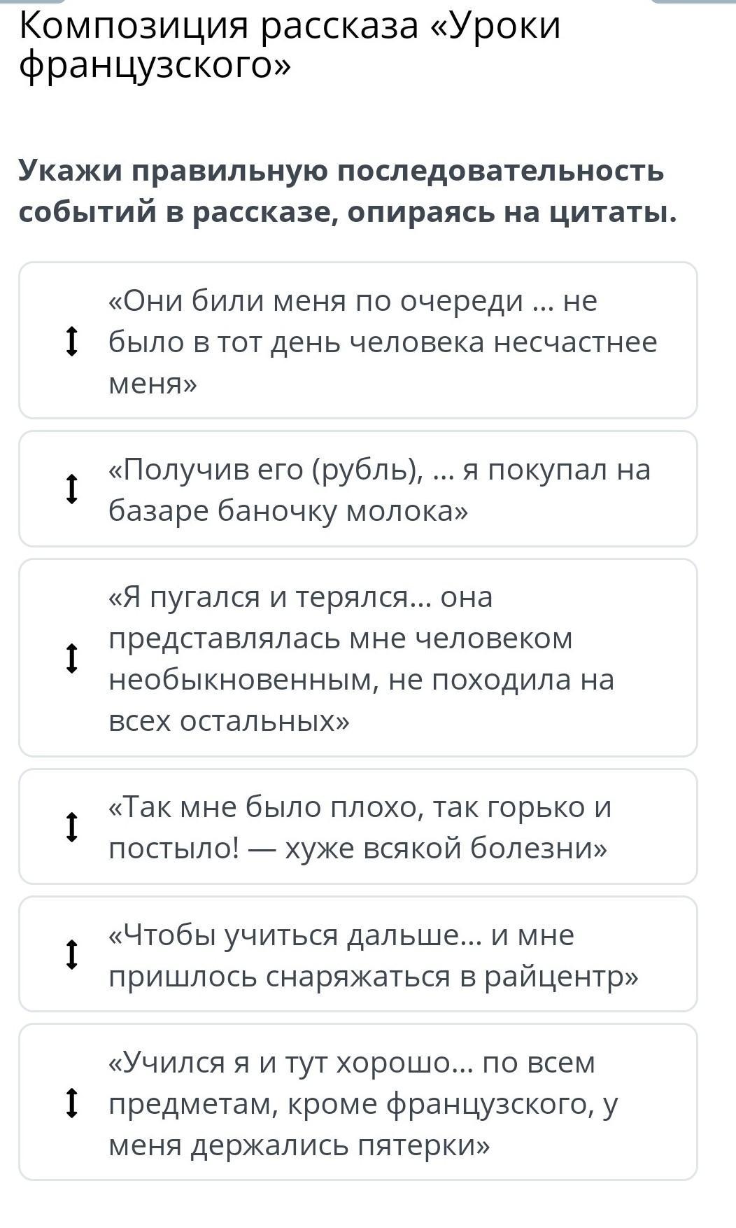 Укажи правильную последовательность событий в рассказе, опираясь на цитаты.