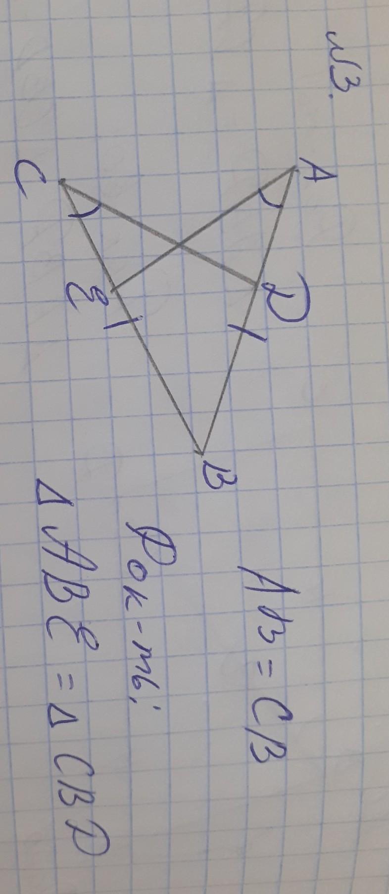 Тогда ∆АВЕ = ∆CBD по стороне и двум прилежащим к ней углам (второй признак равенства треугольников).
