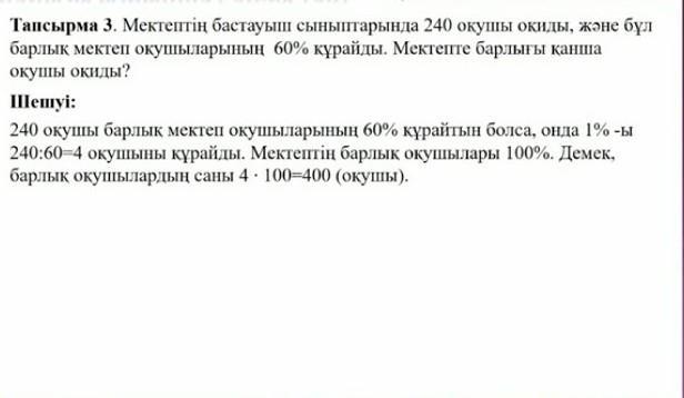 мектептің бастауыш сыныптарында 240 оқушы оқиды, және бұл барлық мектеп оқушыларының 60% құрайды.Мектепте барлығы қанша оқушы оқиды.