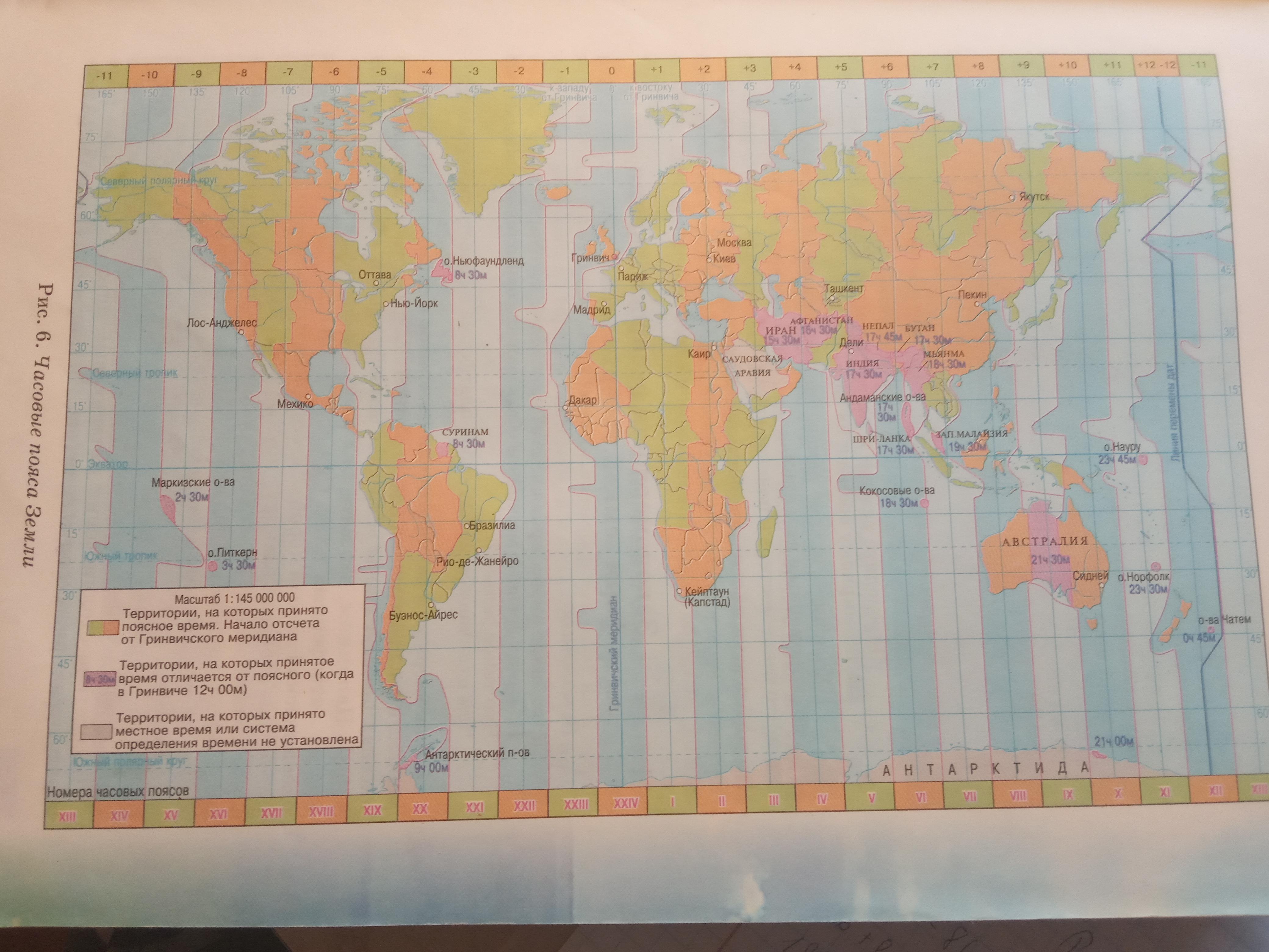По карте часовых поясов установите, в скольких поясах находиться каждый из шести материков,сколько поясов пересекают территорию Украины. Определите, на сколько часов надо перевести часовую стрелку во время переезда летом из Киева в Париж, из Киева в Ташкент, а зимой из Одессы в Лондон, из Одессы в Монреаль.