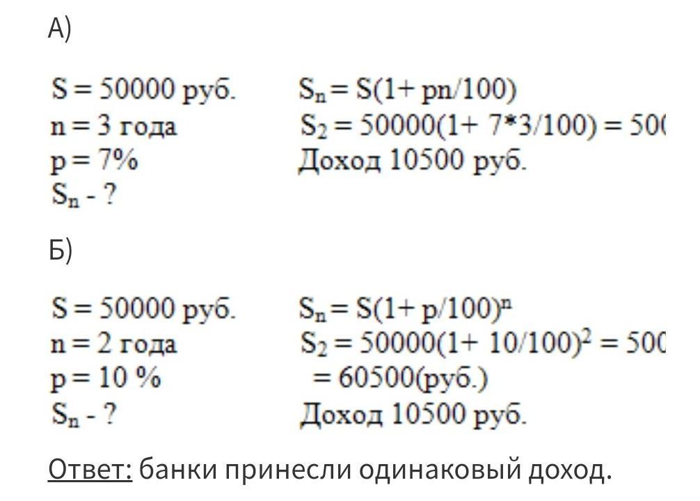 годовых (сложные %). Какой вклад принёс больший доход? Срочно пожалуйста