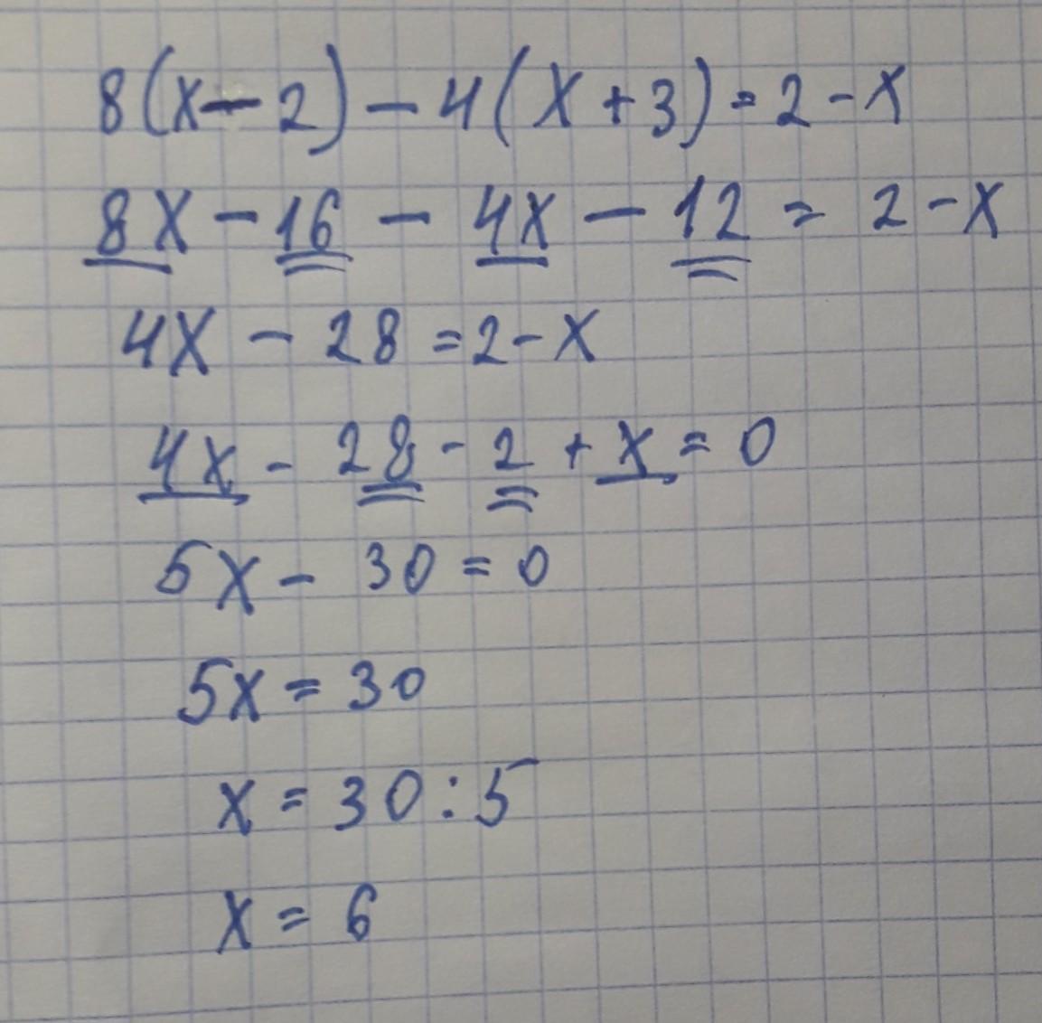 8(х-2)-4(х+3)=2-х 5х-30=0 5х=30 х=30:5 х=6