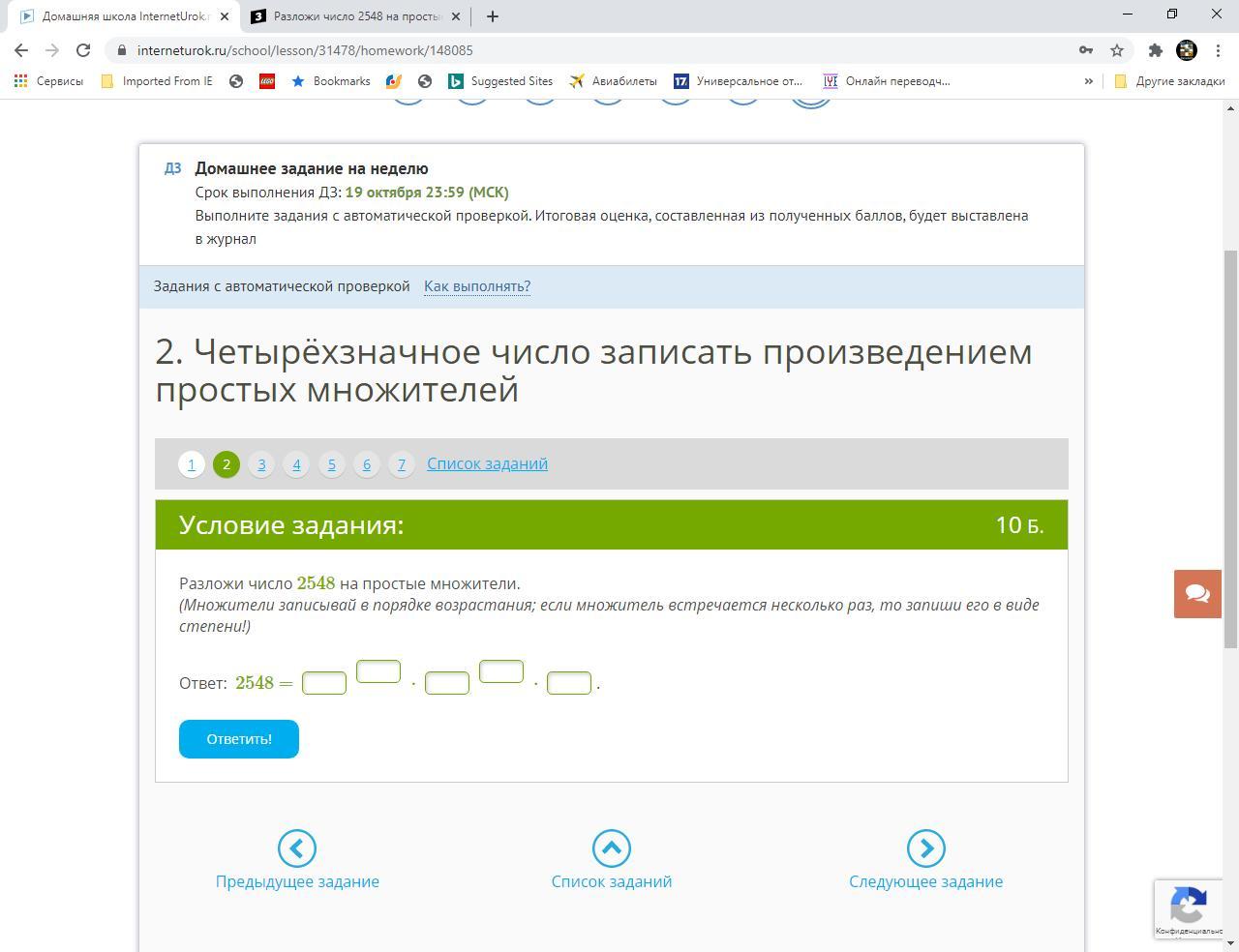 Разложи число 2548 на простые множители. (Множители записывай в порядке возрастания; если множитель встречается несколько раз, то запиши его в виде степени!) Ответ: 2548 =