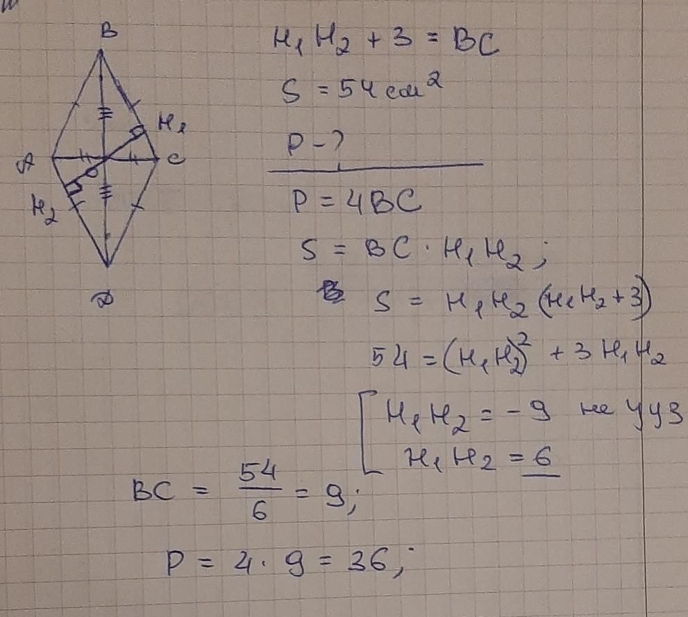 Висота ромба на 3 см менша від його сторони. Знайдіть периметр ромба, якщо його площа дорівнює 54 см квадратних