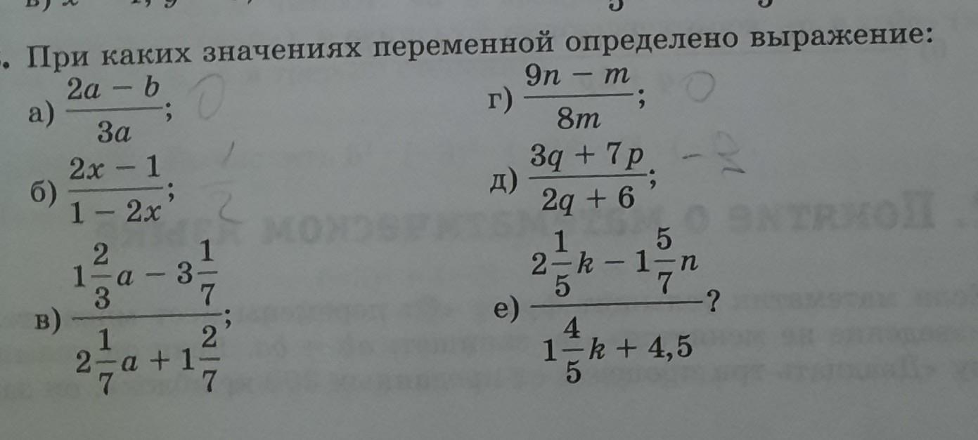 a) a<>0; б) x<>1/2; в)a<>3/5; г) m<>0; д) q<>-3; е)k<>-2.5. Символы <> означают "не равно"