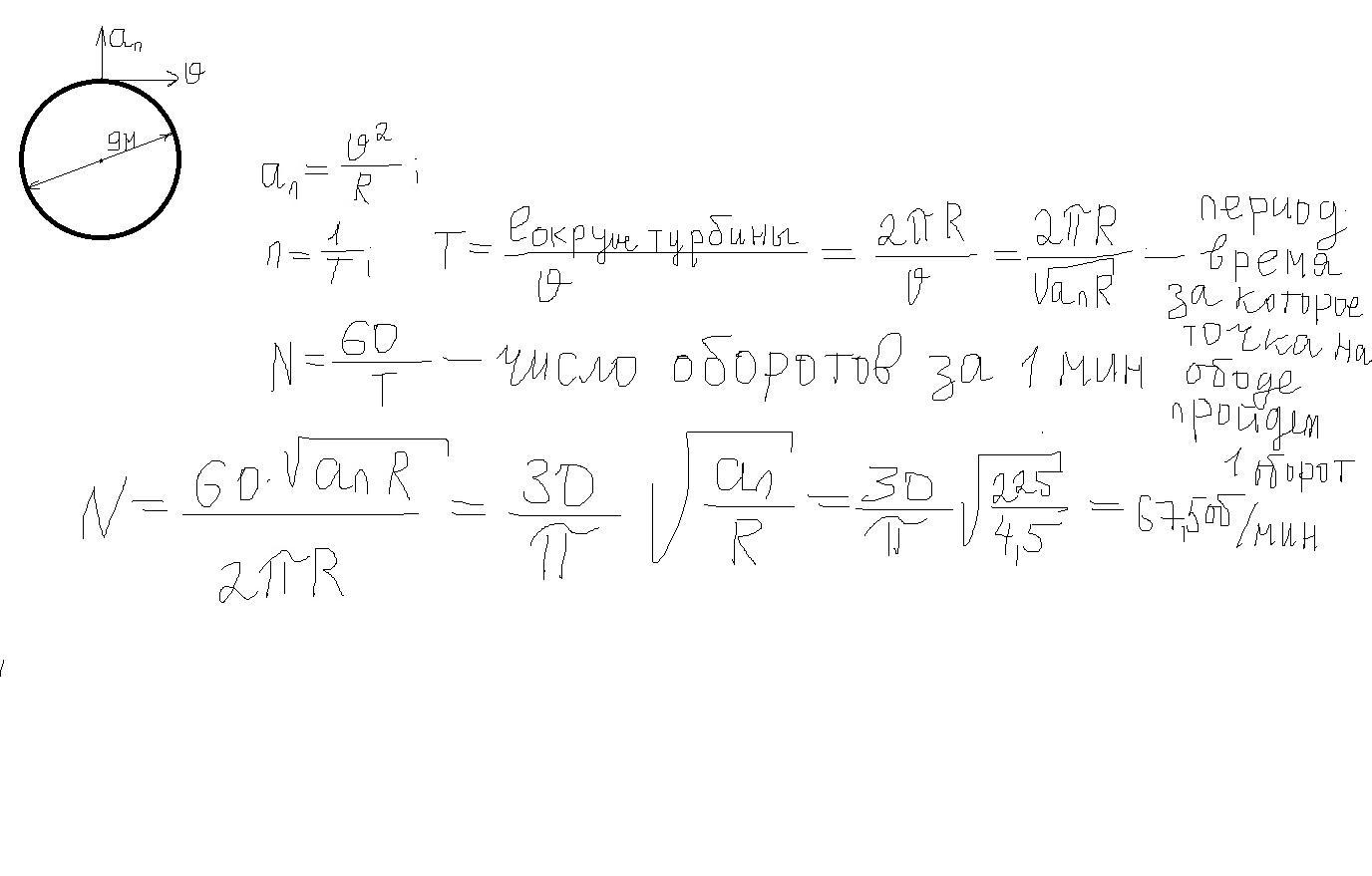 диаметр ротора турбины 9 м. Его центробежное ускорение на краях лопастей составляет 225 м / с². Сколько оборотов делает ротор турбины за 1 минуту?