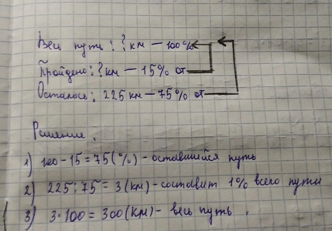 Первые пол часа велосипедист проехал 15 % всего пути, после этого ему осталось проехать 225 км. Сколько всего ему нужно проехать? ПОМОГИТЕ СРОЧНО!!!
