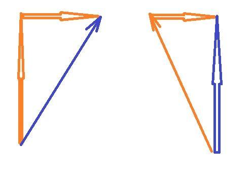 Например, лодка плывет на другой берег. По направлению от кормы к носу ее толкает мотор. Вбок ее движет течение. Если лодочник держит курс перпендикулярно берегам, лодку будет сносить по течению и она реально будет двигаться по диагонали, наискосок. Другой вариант, когда курс направлен слегка против течения, чтобы плыть перпендикулярно берегу. Нарисуйте чертежи для обоих случаев самостоятельно. Разберитесь, где катеты, где гипотенуза.