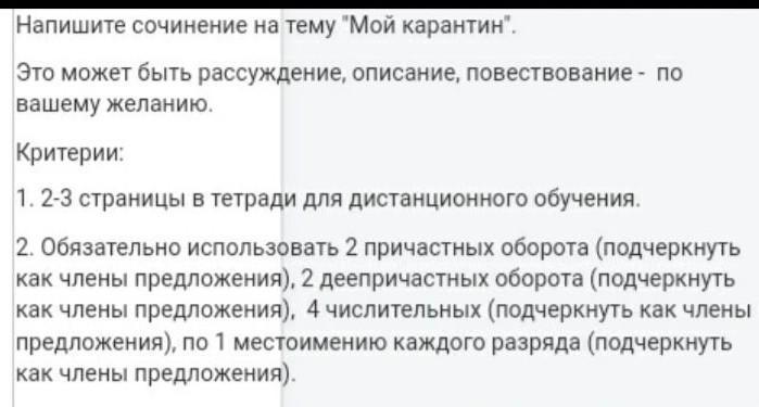 помогите пожалуйста, оооооочень срочно сочинение на тему мой карантин 2 причастных оборота 2 деепричастных оборота 4 числительных и 1 местоимению каждого разряда (и напишите как выделяется это)