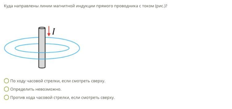 СРОЧНО!!! Куда направлены линии магнитной индукции прямого проводника с током (рис.)? 1.png По ходу часовой стрелки, если смотреть сверху. Определить невозможно. Против хода часовой стрелки, если смотреть сверху.