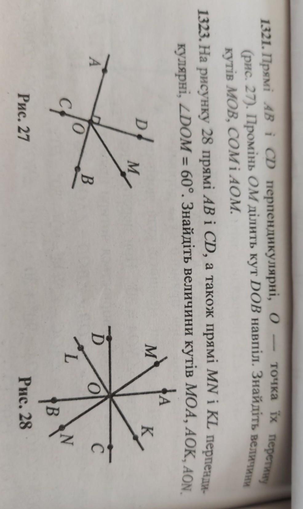 1323. Т.к. АВ⊥СD, MN⊥KL, ∠DОМ=60°, то ∠МОА=∠АОD-∠DОМ=90°-60°=30°;