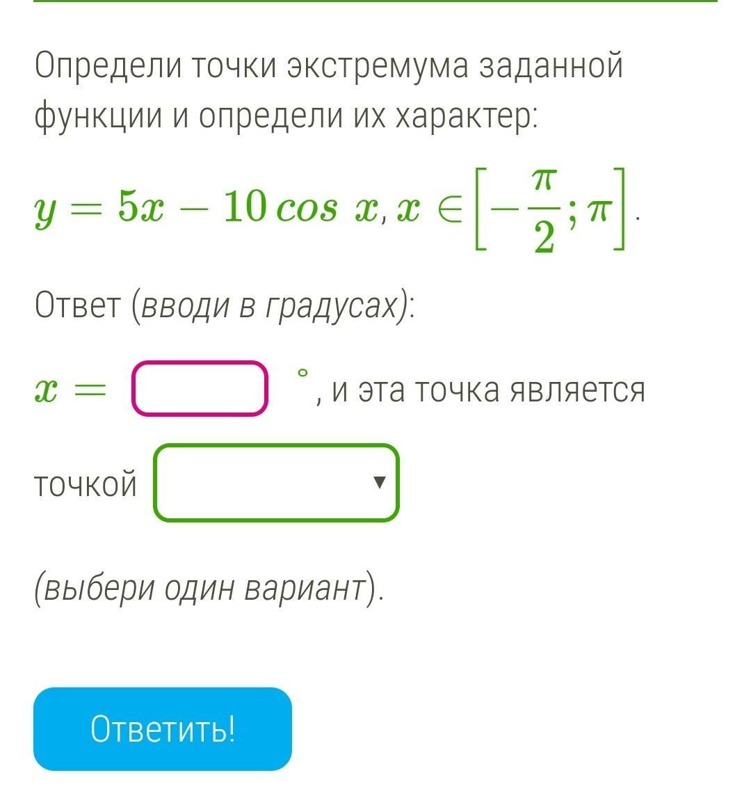 2) -π/2≤5π/6+2πк≤π; -1/2≤5/6+2к≤1; -4/3≤2к≤1/6; -2/3≤к≤1/12; к=0; х=5π/6; х=150° точка минимума