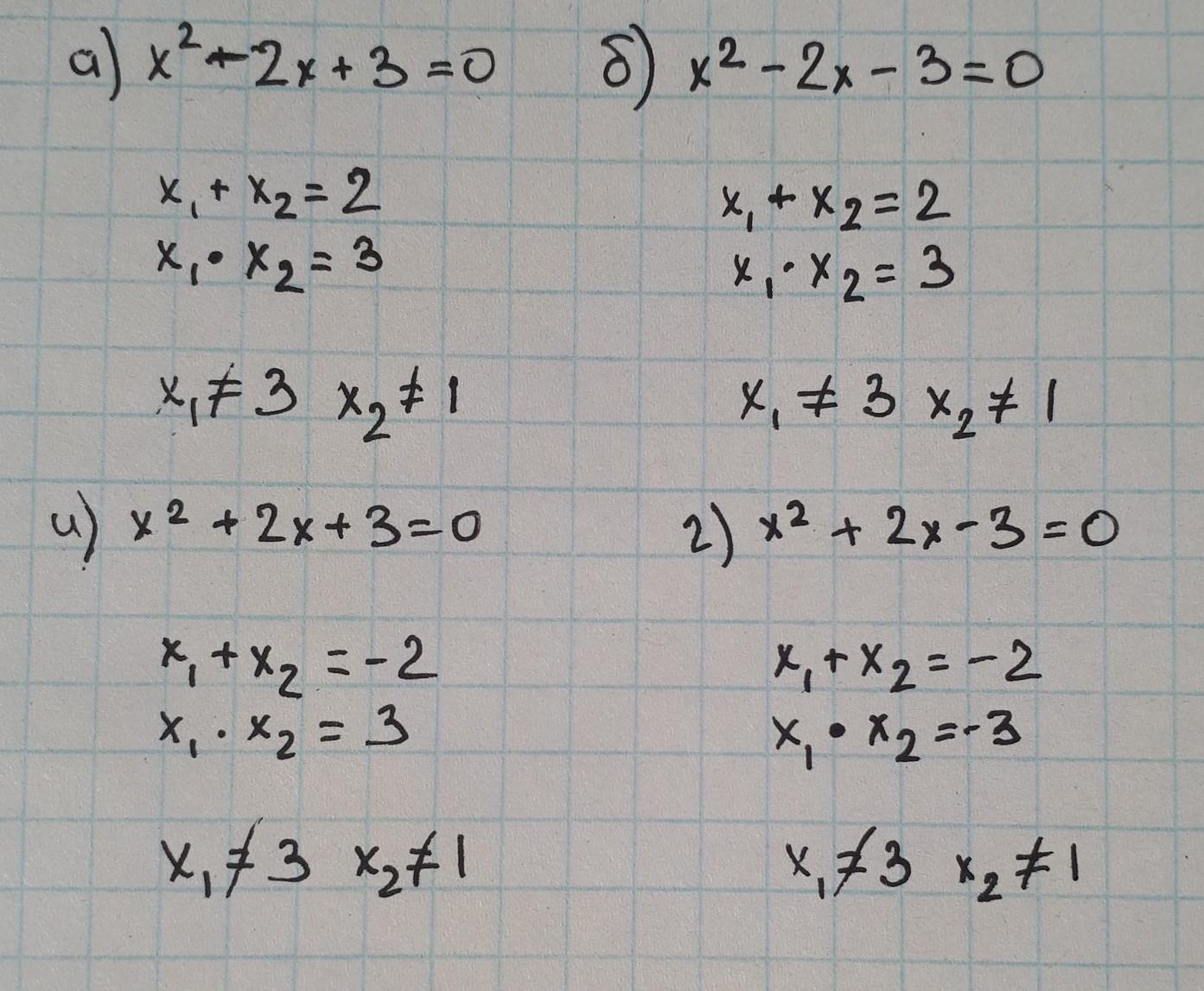 а) x^2-2x+3=0 б) x^2-2x-3=0 и) x^2+2x+3=0 г) x^2+2x-3=0