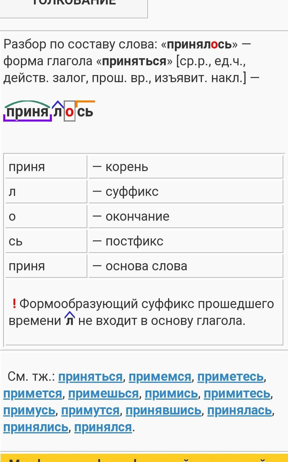 Состав слова «принялось»: корень [приня] + постфикс [л] + окончание [о] + постфикс [сь]