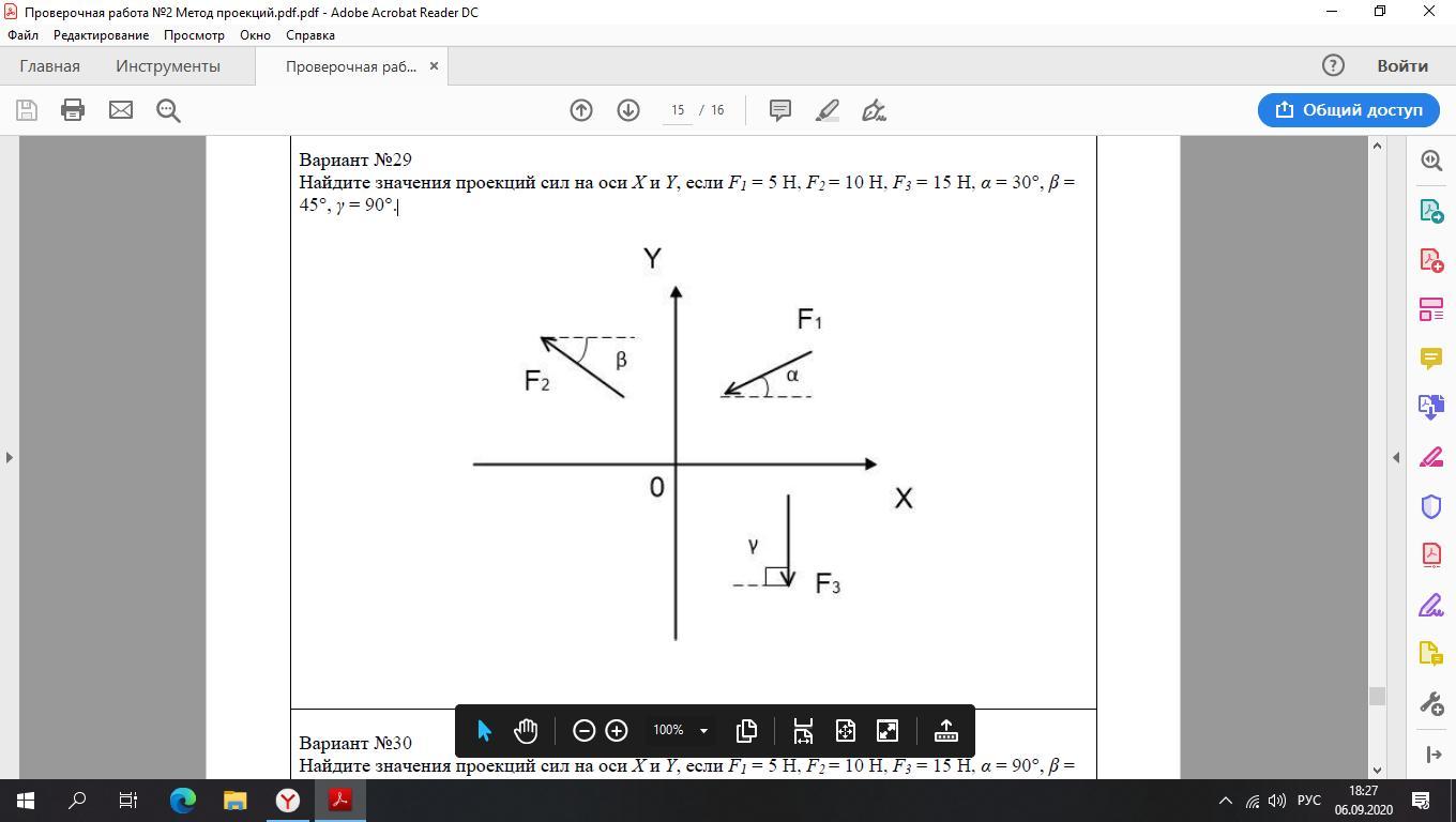 Найдите значения проекций сил на оси Х и Y, если F1 = 5 H, F2 = 10 H, F3 = 15 H, α = 30°, β = 45°, γ = 90°.