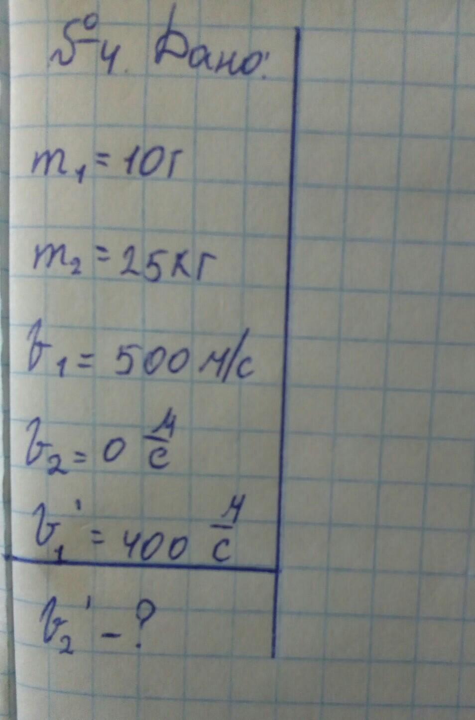 V2¹ = m1*(V1 - V1¹) / m2 = 0.01*(500-400) / 25 = 0.04 м/с