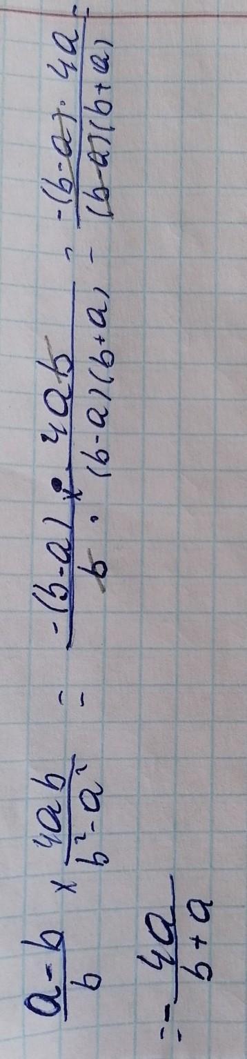 Сокращаем b в числителе и знаменателе, меняем знак и получаем в числителе - (b-a), а в знаменателе b-a и тоже Сокращаем. И получаем ответ: