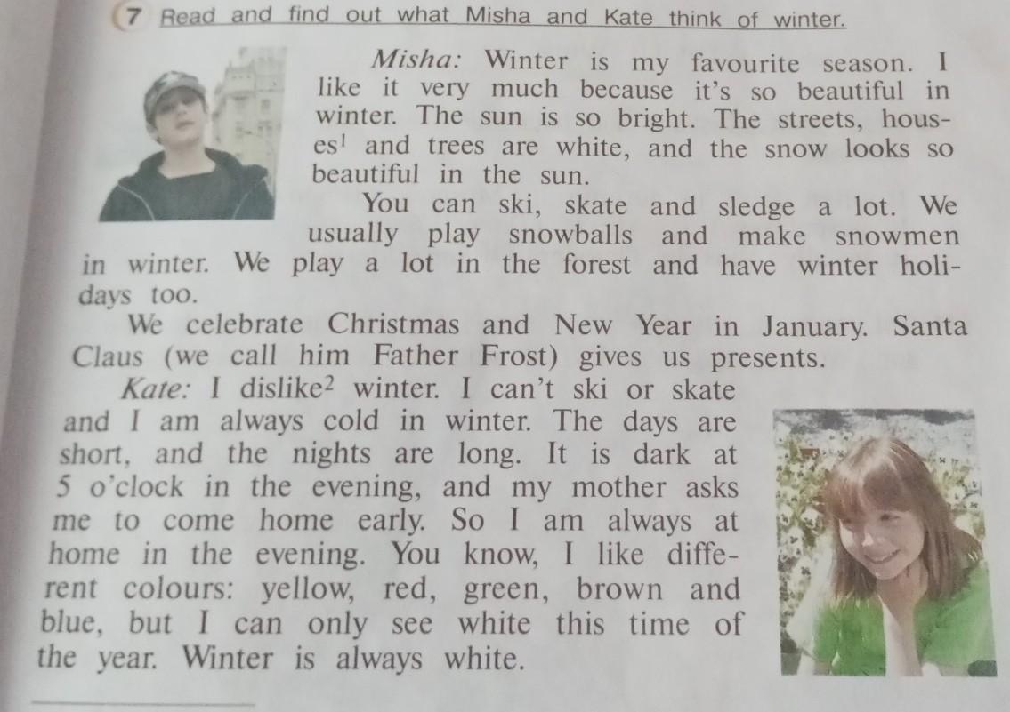 Катя: Я не люблю зиму. Я не могу кататься на лыжах или коньках, и мне зимой постоянно холодно. Дни короткие, а ночи длинные. В 5 часов вечера темно, и моя мама просит меня приходить домой рано. Поэтому я всегда дома вечером. Знаешь, я люблю разные цвета: жёлтый, красный, зелёный, коричневый и синий, но в это время года я вижу только белый. Зима всегда белая.