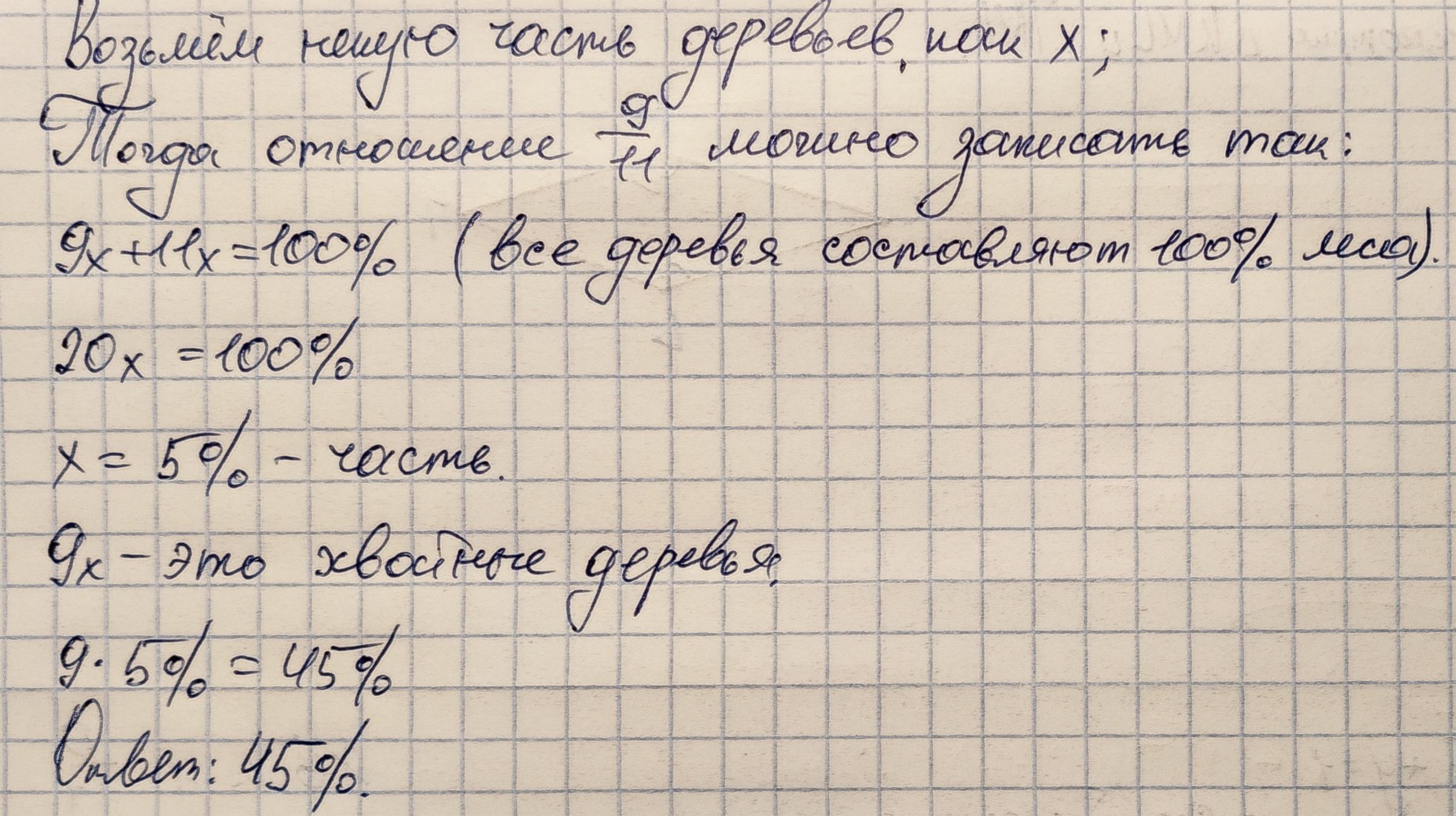 число хвойных деревьев в парке относится к числу лиственных как 9 : 11 соответственно Сколько процентов деревьев в парке составляют хвойные