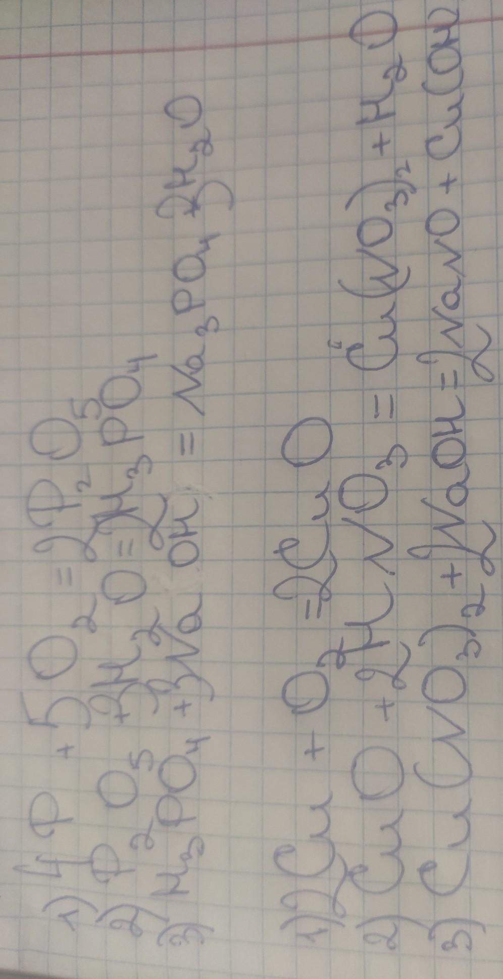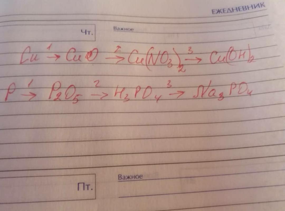 Нужна помощь,сказали решить. Cu¹ ----→CuO²---→Cu(NO3)²---→Cu(OH)² И еще: P¹---→P²O⁵---→H³PO⁴---→Na³PO⁴ Пожалуйста помогите,нужен хотя бы приближенный ответ