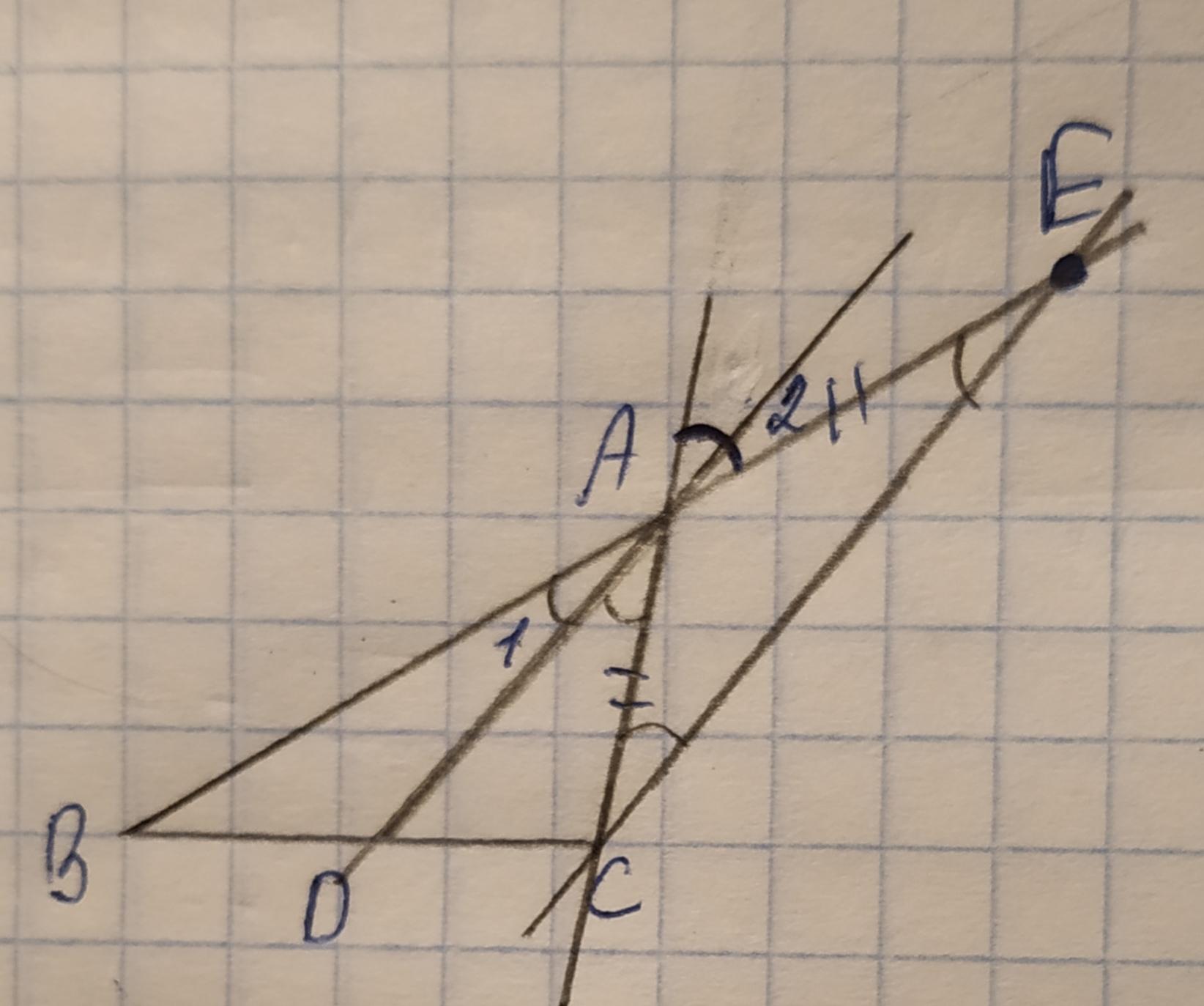 Отрезок AD — биссектриса треугольника ABC. Через точку С проведена прямая, которая параллельна прямой AD и пересекает прямую АВ в точке Е. Определите вид треугольника АСЕ.