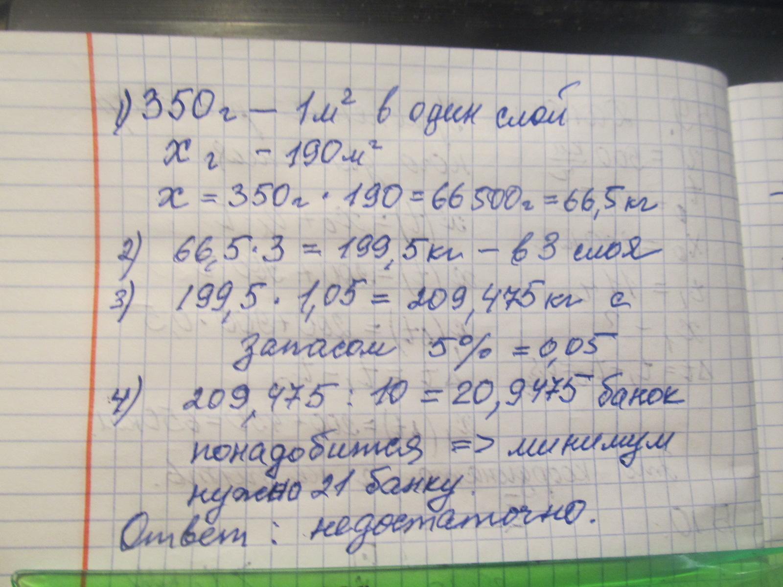 ДАМ 100 БАЛЛОВ На сайте производителя краски указано, что при покраске в два слоя расход может составлять до 700г на 1 м². Необходимо гидроизолировать городской фонтан с внутренней площадью чаши 190 м²? резиновой кра- ской в три слоя. Достаточно ли приобрести для этого 20 банок краски по 10 кг каждая, если необходимо взять краску с запасом 5% от максимального расхода, указанного на сайте производителя?