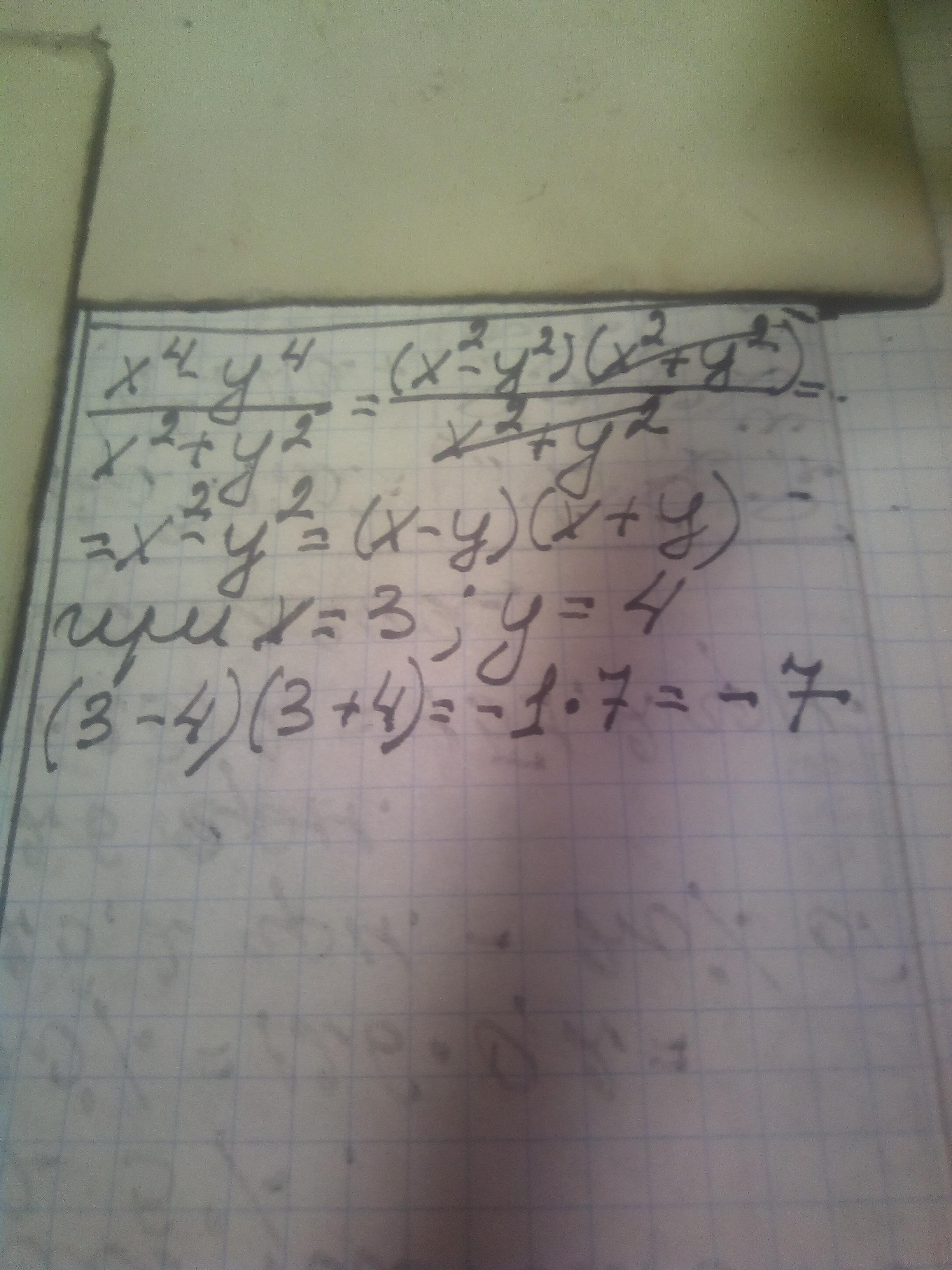 Помогите пожалуйста (снова) =} x⁴-y⁴ ____ x²+y² Необходимо найти значение алгебраической дроби при x=3; y=4
