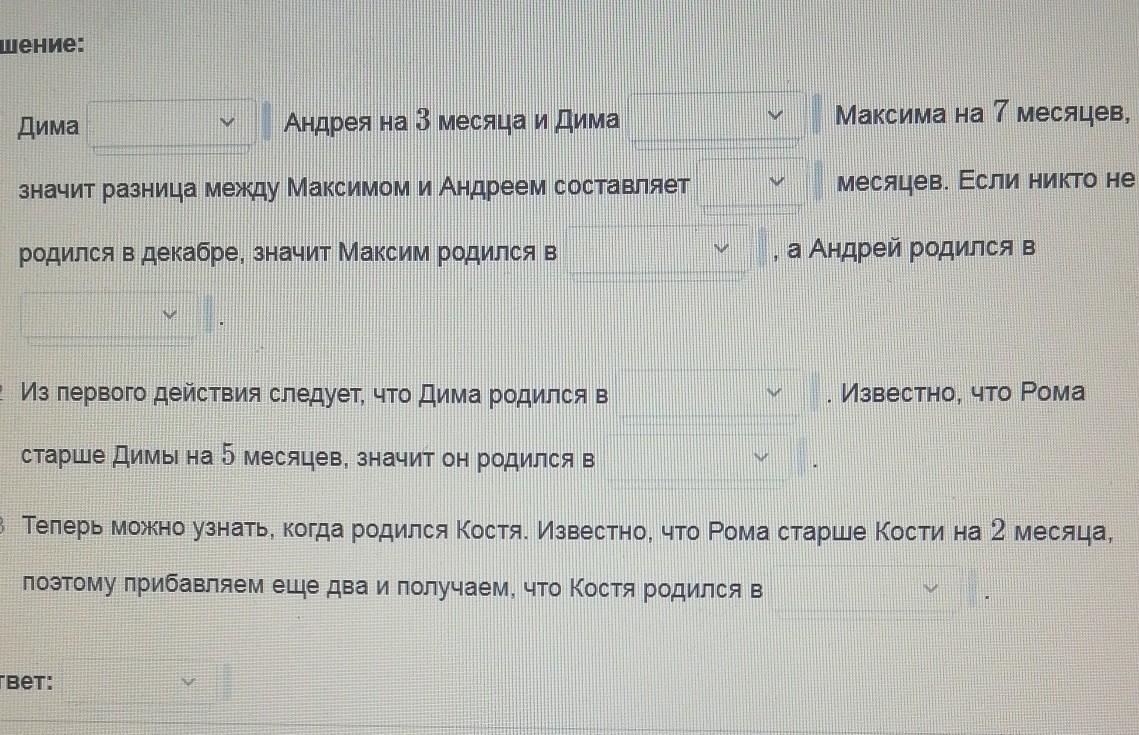 1) Костя пригласил на свой день рождения четверых друзей: Андрея, Диму Максима и Рому, все пять мальчиков включая Костю родились в 2009 году но в разные месяцы в промежутке между 15-ыми и 25-ым числом Дима старше Андрея примерно на 3 месяца, но младше Максима примерно на 7 месяцев Костя младше Ромы примерно на 2 месяца. Рома старше Димы примерно на 5 месяцев