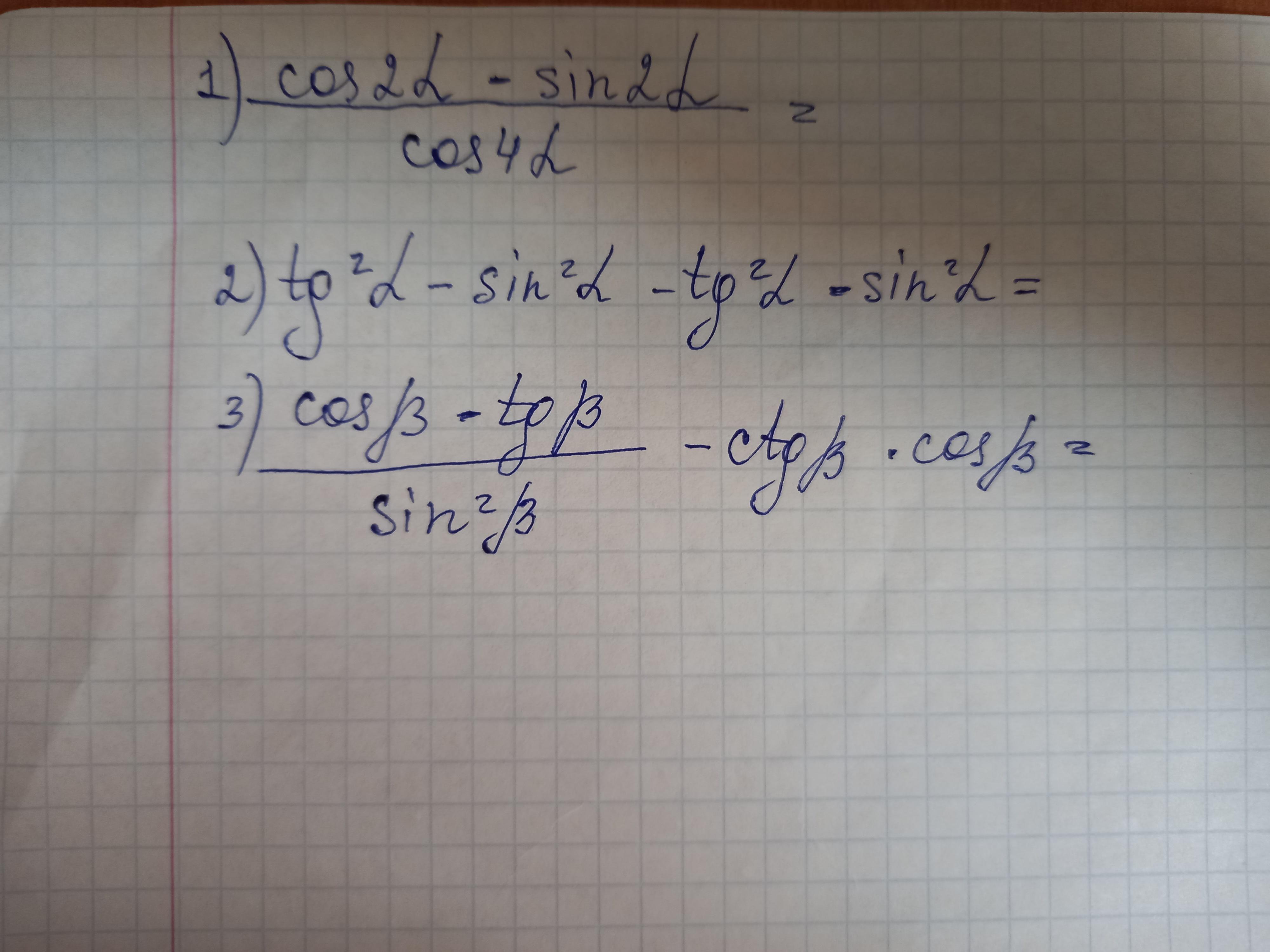 В третьем в условии вместо умножения минус (cosβ-tgβ)/sin²β-ctgβ*cosβ=