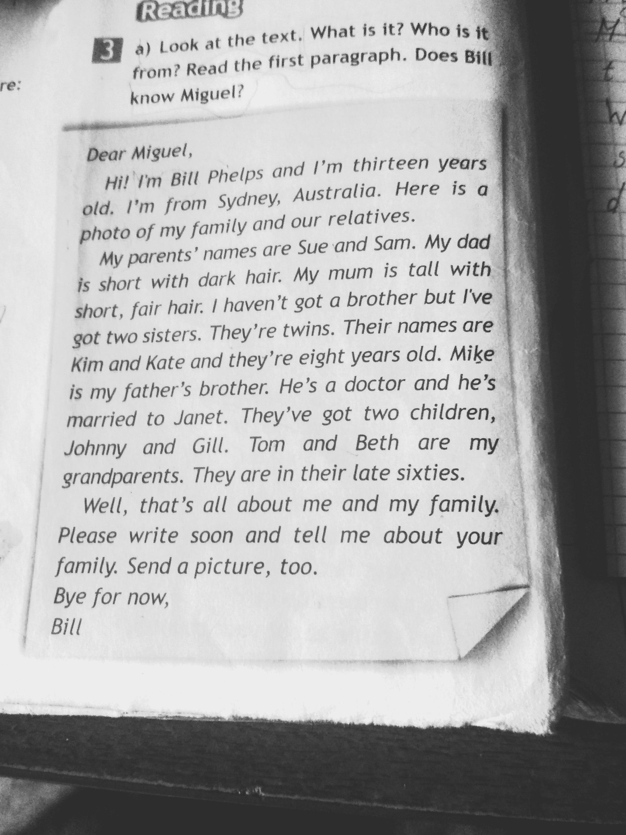 My parent's name are Sofia and John. My dad is tall with dark hair. My mom is short with red hair. I have one brother and one sister. Their names are Michael and Emily, they're thirteen years old. William is my mother's brother. He's a teacher and he's married to Beth. They don't have children yet. David and Jenny are my grandparents. They are in their late seventies.