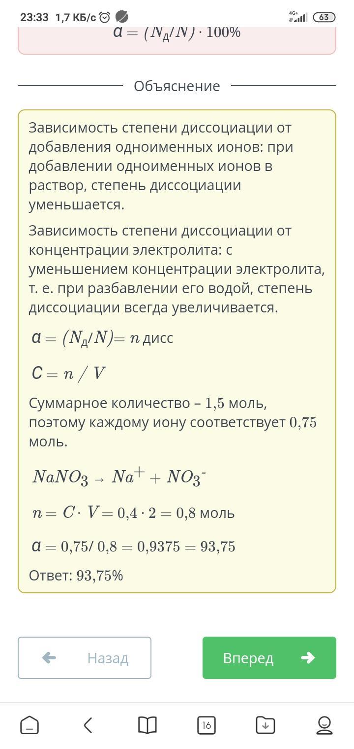 В водном растворе объемом 2 дм3 с молярной концентрацией нитрата натрия равной 0,4 моль/дм3 содержатся ионы суммарным химическим количеством 1,5 моль. Укажи степень диссоциации.