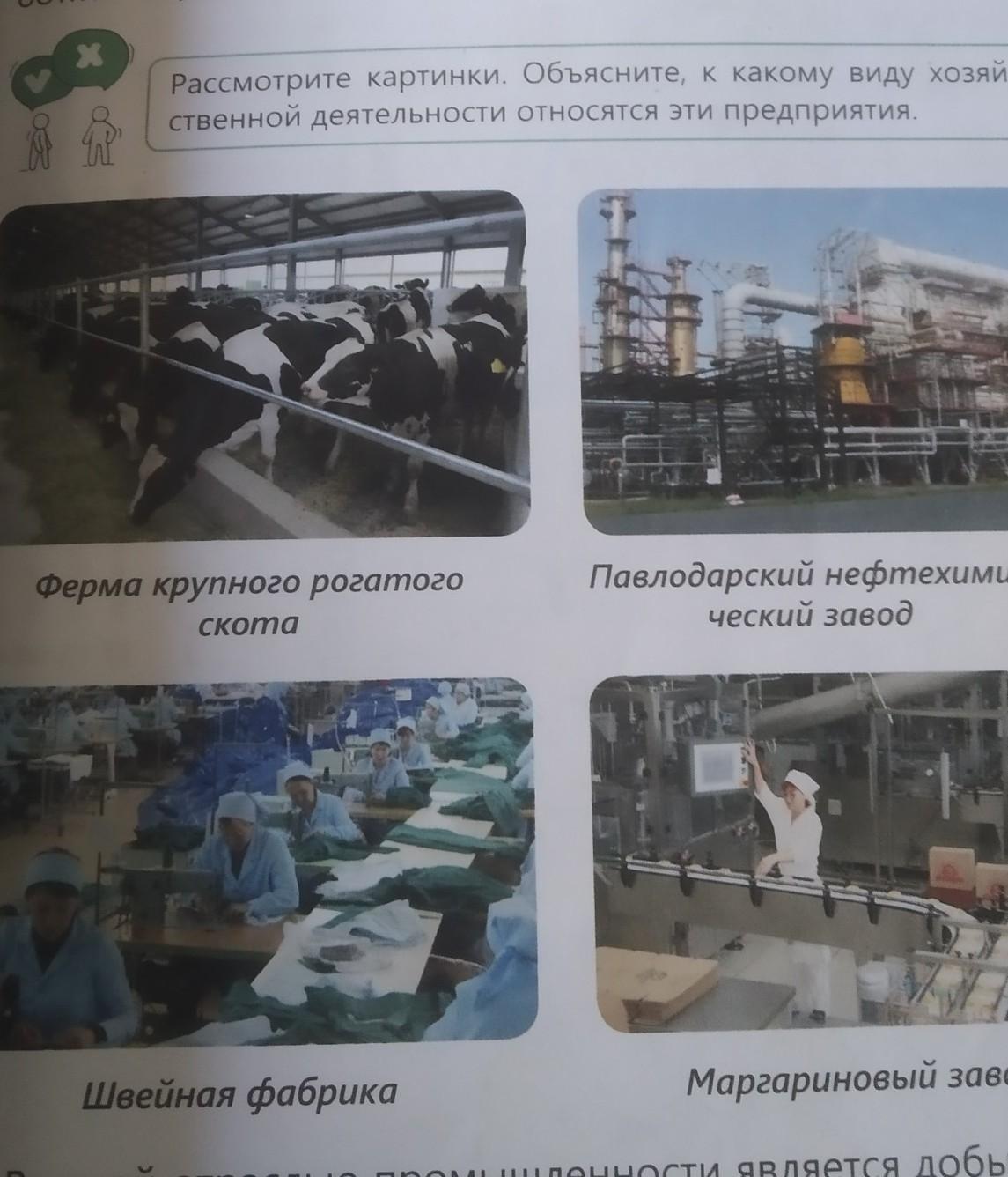 Рассмотрите картинки. объясните в какому виду хозяйственной деятельности относится эти предприятия 1)Ферма Крупного Рогатого скота 2)Павлодарский нефтехимический завод 3)Швейная Фабрика 4)Маргариновый завод
