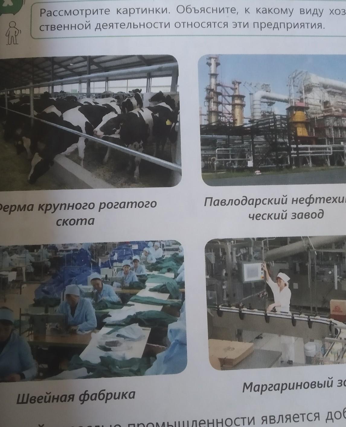 Рассмотри Картинки Объясни к какому виду Хозяйственной деятельности относится эти предприятия 1) Ферма Крупного Рогатого скота 2) Павлодарский нефтехимический завод 3) Швейная Фабрика 4) Маргариновый завод