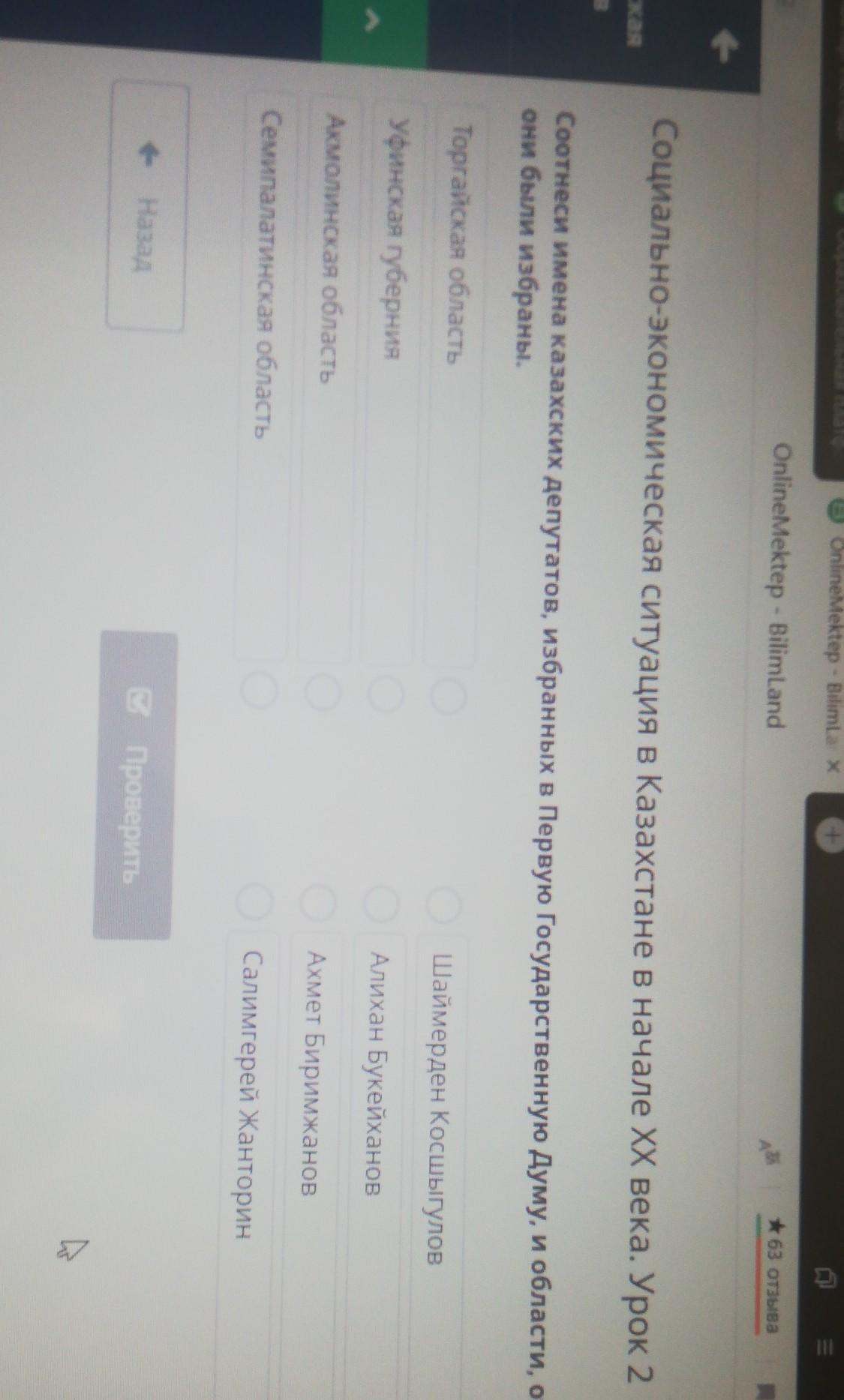Соотнесите имена казахских депутатов избранных в первую Государственную Думу и области откуда они были избраны: