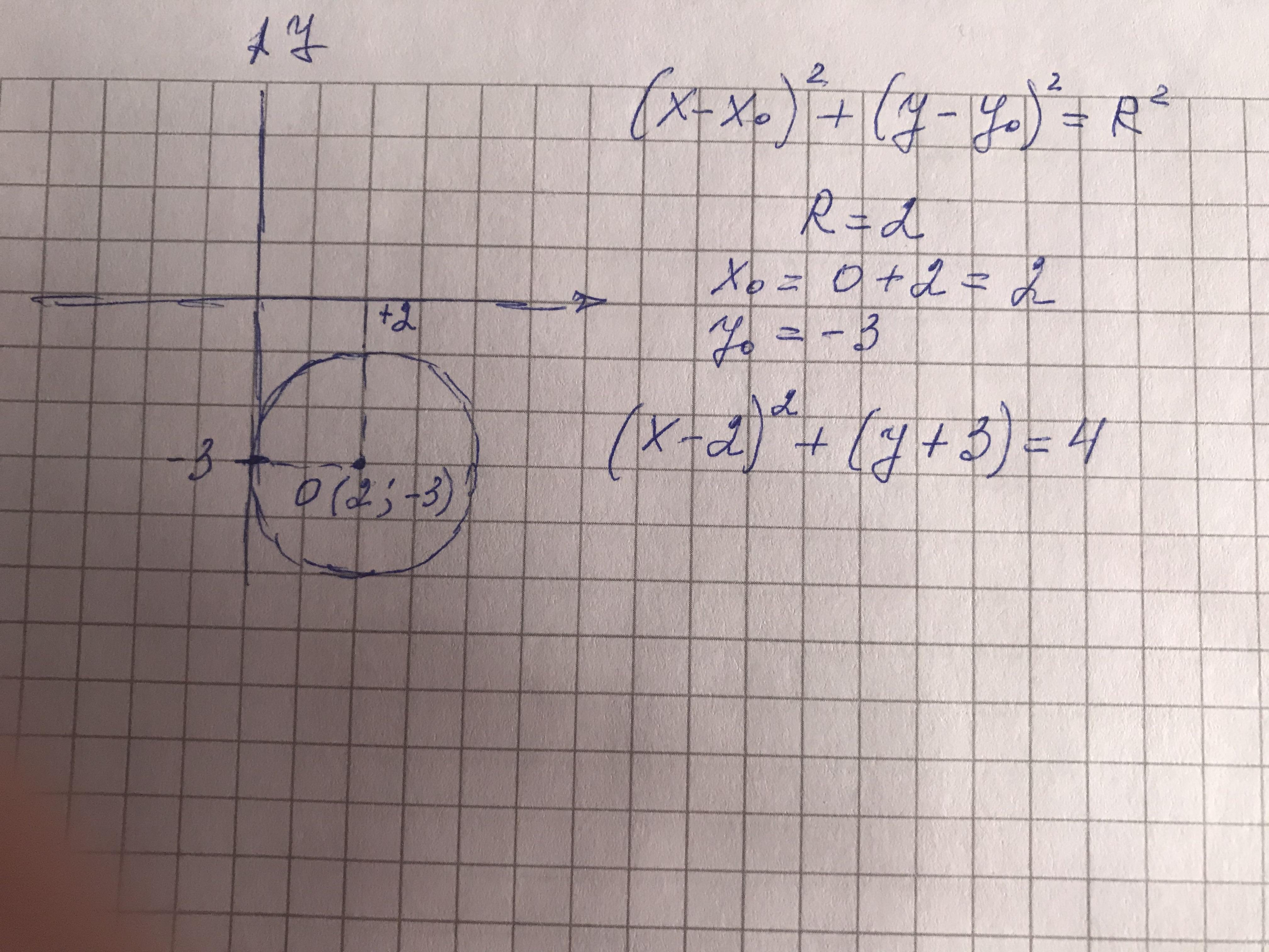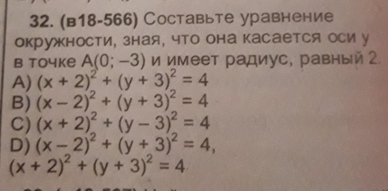 Расстояние от точки касания до до центра 2, значит координаты центра (2;-3) . R=2. Ну значит ответ В