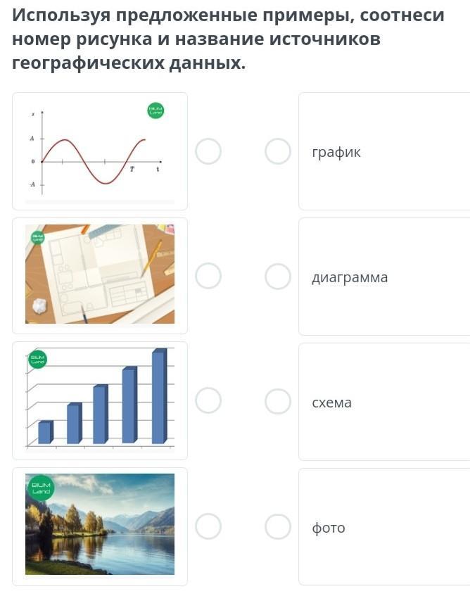 Используя предложенные примеры, соотнеси номер рисунка и название источников географических данных.
