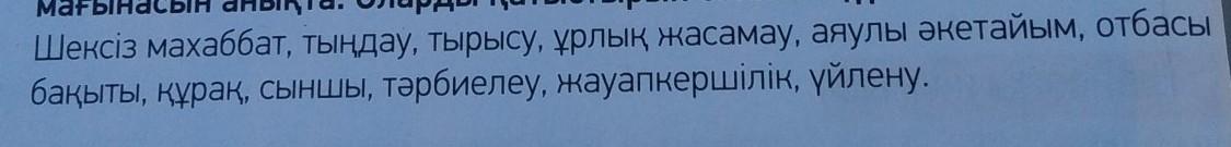 Деректі зат есім: Шексіз махаббат,тырысу,ұрлық жасамау,құрақ,сыншы.