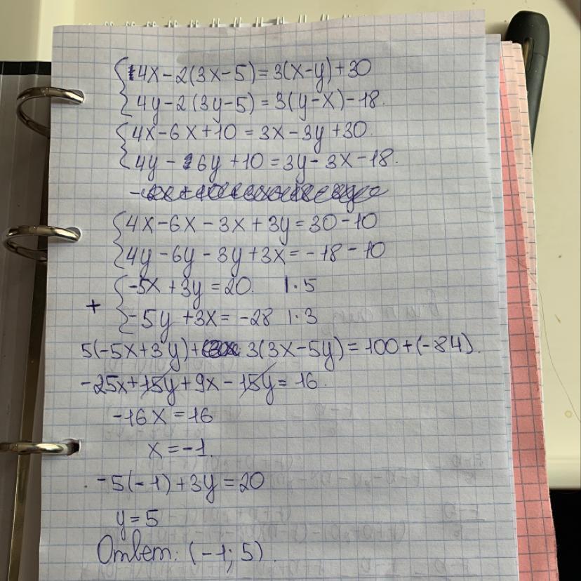(4x - 2(3x - 5) = 3(x - y) + 30,